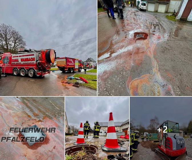Auslaufende Betriebsstoffe während Bauarbeiten, welche sich durch starken Regen ins Erdreich und ein angerenzendes Gewässer ausbreiteten.
