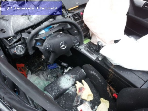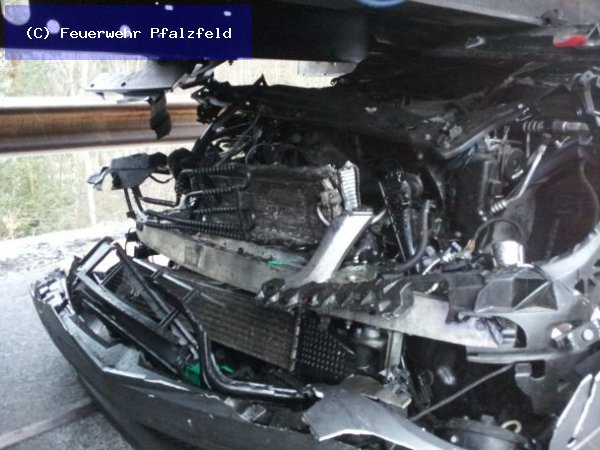 Am morgen des 13.02.2012 wurde die FFW Pfalzfeld auf die BAB 61 in Fahrtrichtung Süden gerufen. Meldung: Verkehrsunfall mit LKW und PKW, eingeklemmte Person. Beim eintreffen an der Unfallstelle sahen wir, dass der PKW ein Mercedes unter den Anhänger des LKW gefahren war. Der Fahrer war schwer verletzt eingeklemmt. Mittels Rettungsschere und Spreitzer wurden die Türen entfernt, sowie das Dach. Erst dann konnte der Fahrer patientengerecht gerettet werden.