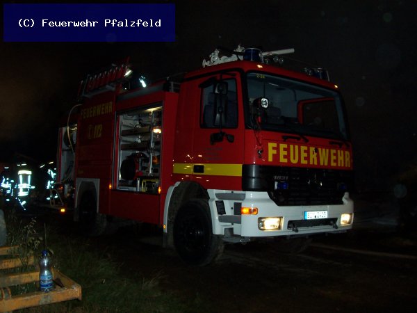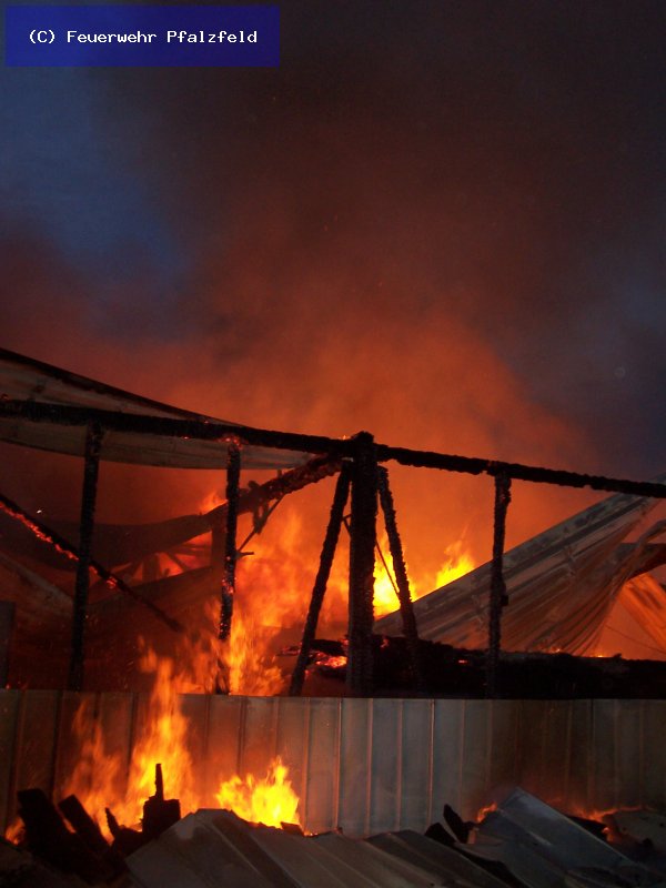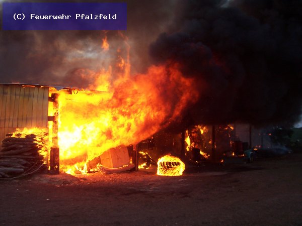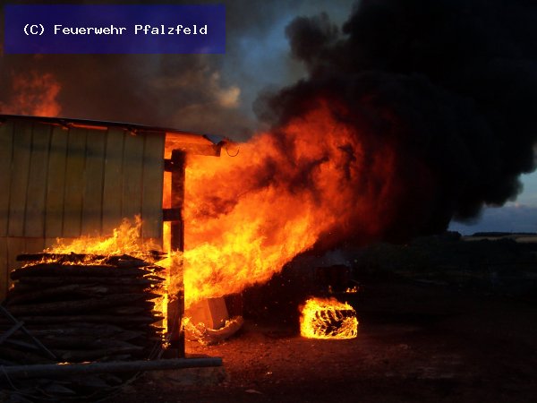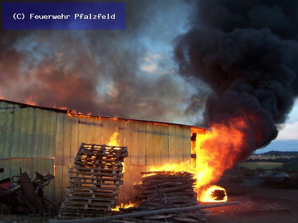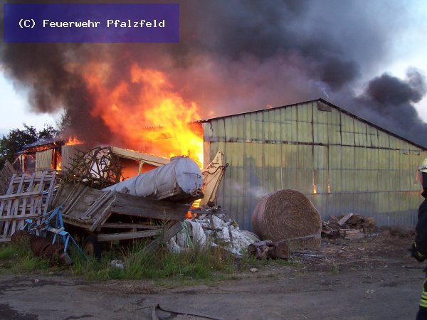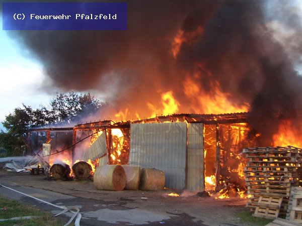 Am Abend des 02.08.2012 wurde die FFW Pfalzfeld alarmiert. Meldung: Brand in Mühlpfad. Schon beim Verlassen des Ortes sahen wir, dass es sich dabei um eine Scheune handelt, welche inmitten von Feldern steht. Diese stand bereits im Vollbrand und es schlugen Flammen aus dem Dach. Die gesamte VG-Feuerwehr, sowie die Kameraden aus Buchholz bekämpften über Stunden die Flammen. Ein Übergreifen auf die nahe gelegenen Felder konnte verhindert werden, leider nicht das völlige ausbrennen der Scheune. Ein Mähdrescher, mehrere Traktoranhänger, ein Mulitifunktionsbagger, 130 Strohballen und ca. 150 Meter Brennholz uvm. vielen den Flammen zum Opfer. Die Feuerwehr Pfalzfeld kehrte erst nach 14 Stunden Löscharbeit an ihren Standort zurück. Die Nachlöscharbeiten dauerten noch einige Tage an.