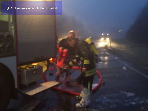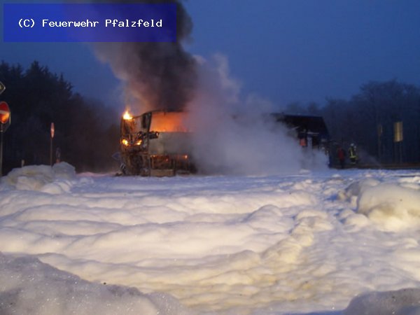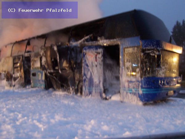 Am 02.01.09 wurde die FFW Pfalzfeld zur Autobahnabfahrt Pfalzfeld gerufen. Hier stand ein Bus im Vollbrand. Die Bekämpfung dauerte einige Stunden an. Der Brand konnte nur unter einsatz von Schaummitteln unter Kontrolle gebracht werden.
