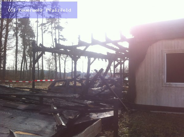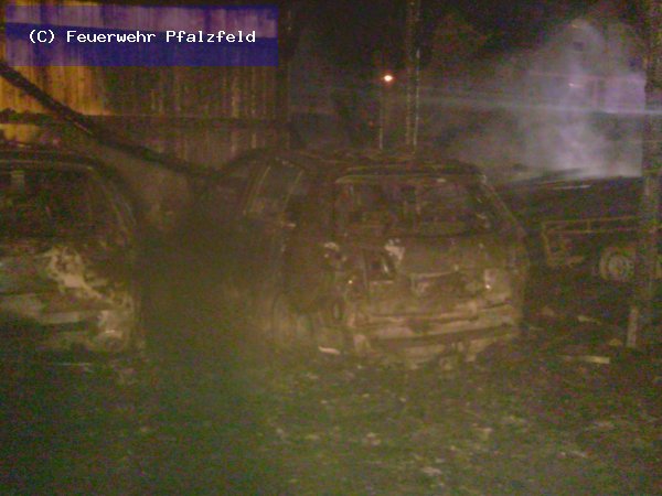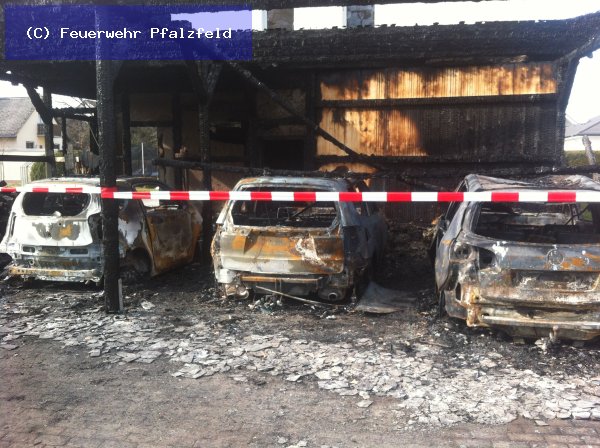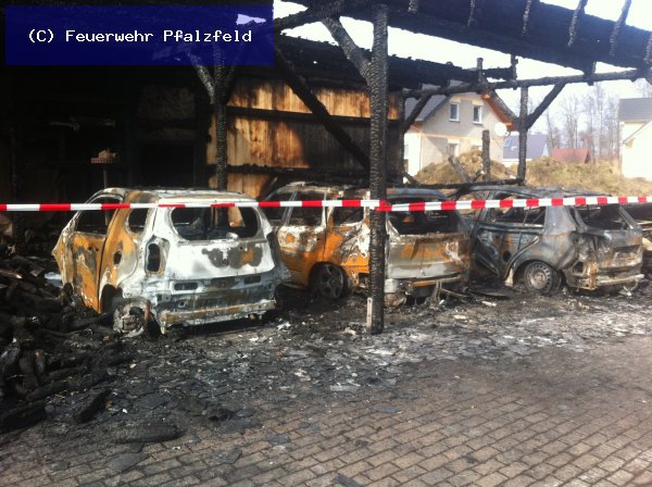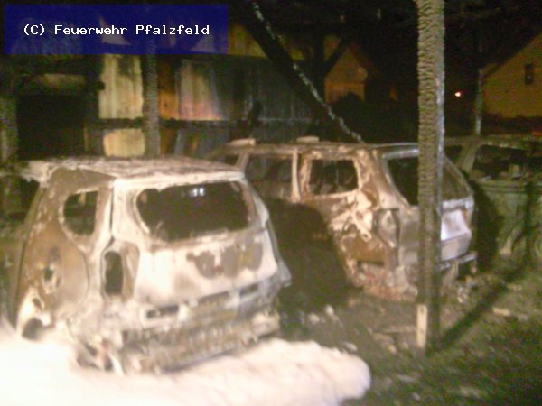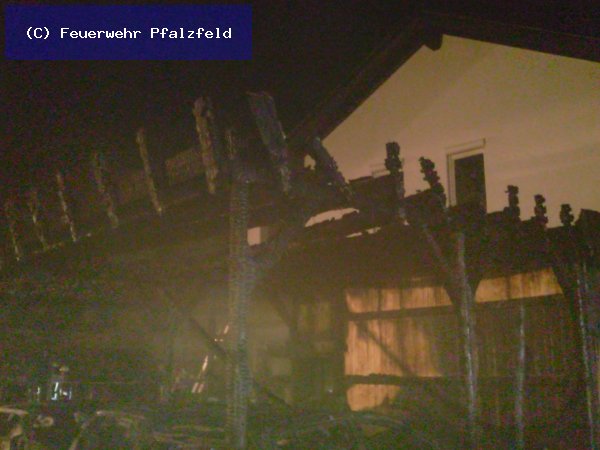 Die Feuerwehren aus Pfalzfeld und Lingerhahn wurden in der Nacht zum 22.03.2013 zu einem Gebäudebrand nach Lingerhahn in die Maisborner Straße gerufen. Beim eintreffen des ersten Einsatzfahrzeuges (TLF Pfalzfeld) stand ein Carport inkl. Geräteschuppen (8X10m) im Vollbrand! Im Inneren befanden sich unteranderem 3 PKW. Die Einsatzkräfte bauten sofort eine Riegelstellung zum angrenzenden Wohnhaus auf, welches ohne großen Sachschaden gehalten werden konnte. Der Verlust des Schuppen inkl. Fahrzeuge war trotz massiven Löscheinsatz nicht zu verhindern. Die Kriminalpolizei war vor Ort, und Ermittelt in alle Richtungen.