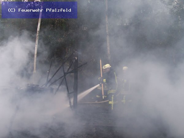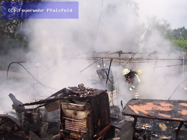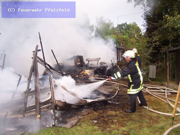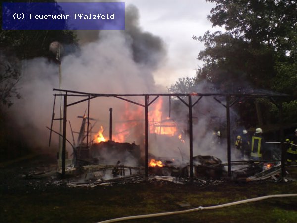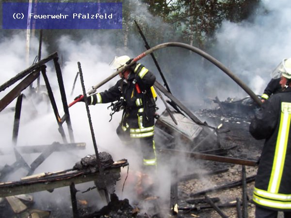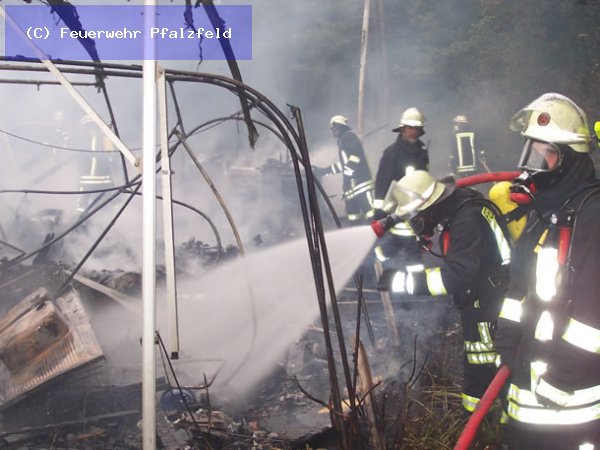 Am 09.07.08 wurden die FFW Pfalzfeld und Lingerhahn auf den Campingplatz nach Hausbay gerufen. Hier stand ein Wochenendhaus im Vollbrand. Im Haus waren mehrere Gasflaschen gelagert. Es konnte schlimmeres verhindert werden.