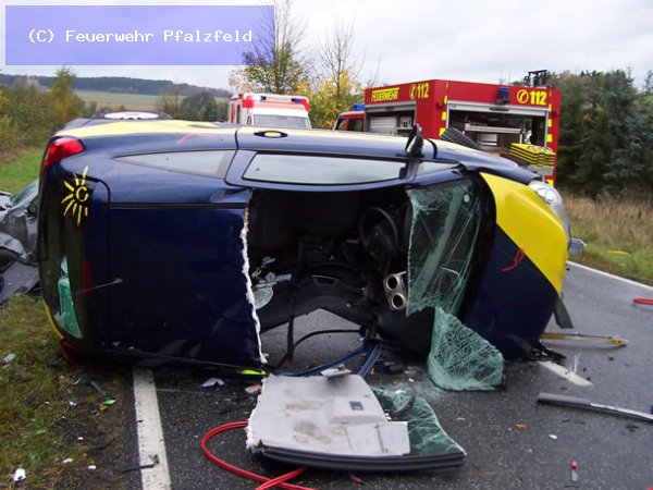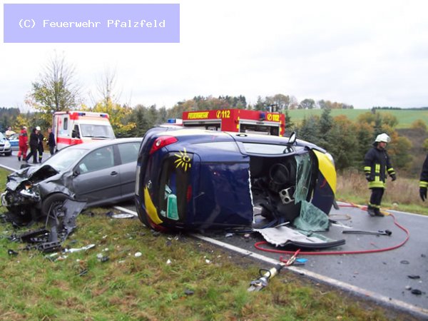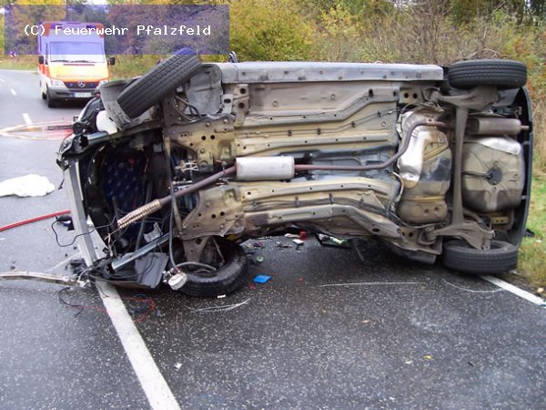 Am 21.10.08 wurde die FFW Pfalzfeld auf die L215 zwischen Pfalzfeld und Mühlpfad gerufen. Hier ereignete sich ein schwerer Verkehrsunfall mit 2 Fahrzeugen. Eine Person wurde im Fahrzeug eingeklemmt und musste mittels Rettungschere und Spreitzer befreit werden. 1 Person Ex.