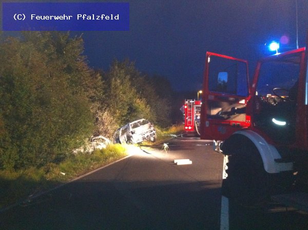 Am Abend des 03.09.12 wurde die FFW Pfalzfeld nach Wiebelsheim gerufen um mit dem Tanklöschfahrzeug die Kameraden aus Wiebelsheim, Laudert, Perscheid und Oberwesel zu unterstützen. Ein Fahrzeug aus Richtung Laudert kommend kam in Höhe Wiebelsheim kurz vor der Abbiegung Richtung Perscheid von der Fahrbahn ab und überschlug sich. Der Wagen blieb auf dem Dach liegen und fing Feuer. Die zwei Insassen konnten glücklicher Weise von Anwohnern aus dem Fahrzeug befreit werden. Eine Person wurde verletzt dem Rettungsdienst übergeben. Der Wagen wurde mittels Schaum abgelöscht.