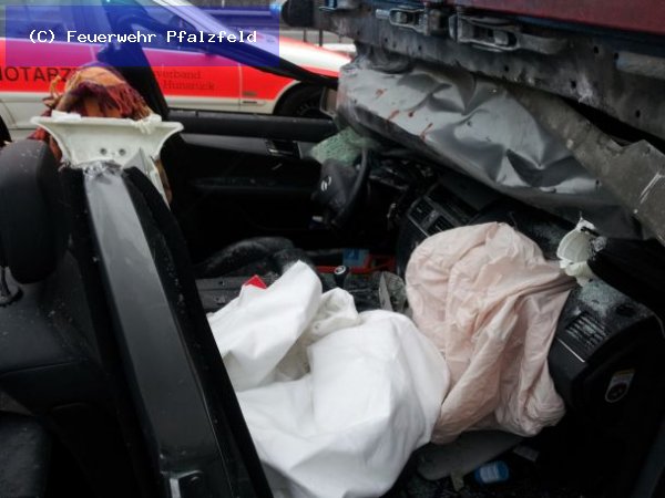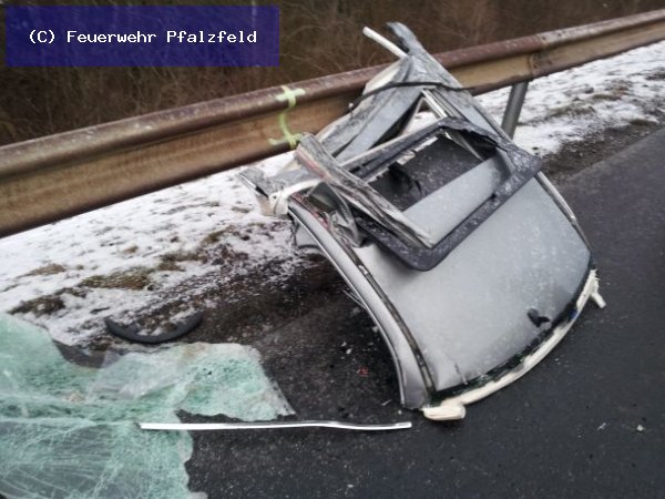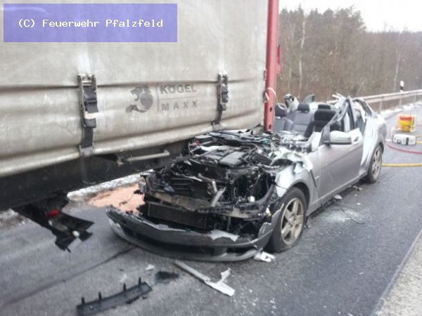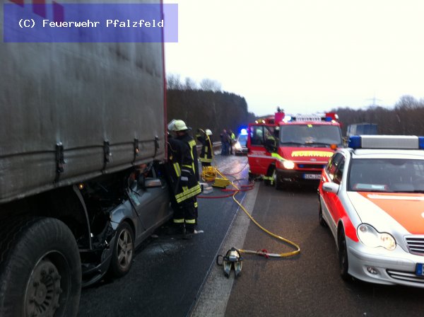 Am morgen des 13.02.2012 wurde die FFW Pfalzfeld auf die BAB 61 in Fahrtrichtung Süden gerufen. Meldung: Verkehrsunfall mit LKW und PKW, eingeklemmte Person. Beim eintreffen an der Unfallstelle sahen wir, dass der PKW ein Mercedes unter den Anhänger des LKW gefahren war. Der Fahrer war schwer verletzt eingeklemmt. Mittels Rettungsschere und Spreitzer wurden die Türen entfernt, sowie das Dach. Erst dann konnte der Fahrer patientengerecht gerettet werden.