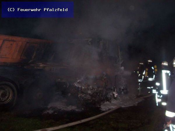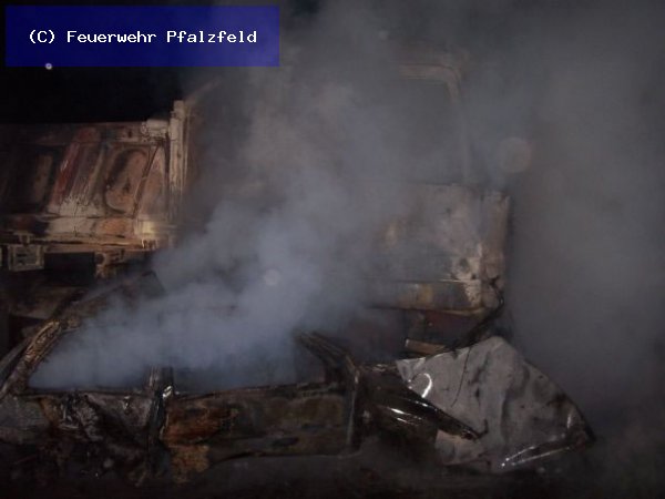 Der verunfallte PKW ging sofort in Flammen auf und brannte, ebenso wie das Führerhaus des deutschen Lastzuges vollkommen aus.