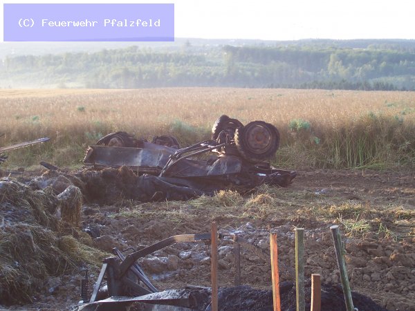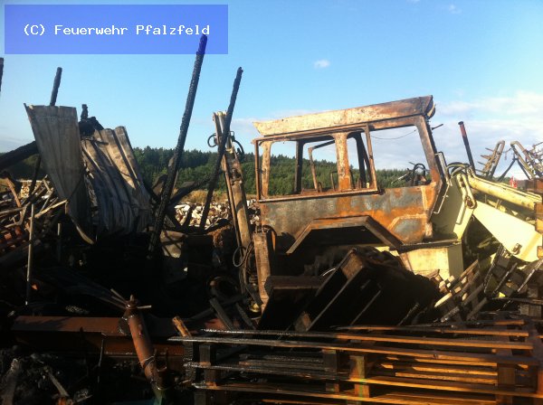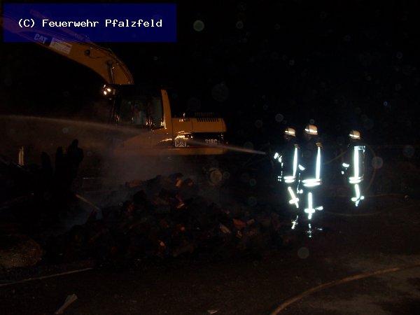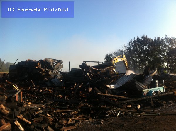 Am Abend des 02.08.2012 wurde die FFW Pfalzfeld alarmiert. Meldung: Brand in Mühlpfad. Schon beim Verlassen des Ortes sahen wir, dass es sich dabei um eine Scheune handelt, welche inmitten von Feldern steht. Diese stand bereits im Vollbrand und es schlugen Flammen aus dem Dach. Die gesamte VG-Feuerwehr, sowie die Kameraden aus Buchholz bekämpften über Stunden die Flammen. Ein Übergreifen auf die nahe gelegenen Felder konnte verhindert werden, leider nicht das völlige ausbrennen der Scheune. Ein Mähdrescher, mehrere Traktoranhänger, ein Mulitifunktionsbagger, 130 Strohballen und ca. 150 Meter Brennholz uvm. vielen den Flammen zum Opfer. Die Feuerwehr Pfalzfeld kehrte erst nach 14 Stunden Löscharbeit an ihren Standort zurück. Die Nachlöscharbeiten dauerten noch einige Tage an.