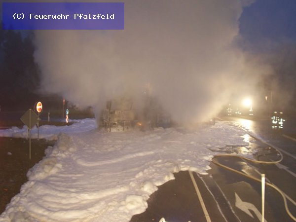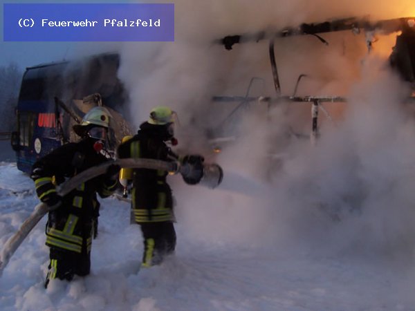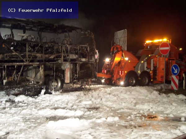 Am 02.01.09 wurde die FFW Pfalzfeld zur Autobahnabfahrt Pfalzfeld gerufen. Hier stand ein Bus im Vollbrand. Die Bekämpfung dauerte einige Stunden an. Der Brand konnte nur unter einsatz von Schaummitteln unter Kontrolle gebracht werden.
