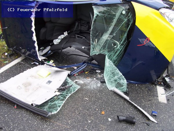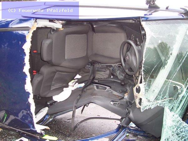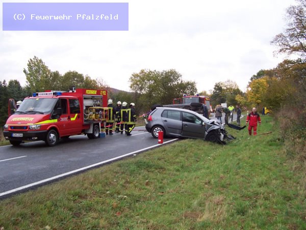 Am 21.10.08 wurde die FFW Pfalzfeld auf die L215 zwischen Pfalzfeld und Mühlpfad gerufen. Hier ereignete sich ein schwerer Verkehrsunfall mit 2 Fahrzeugen. Eine Person wurde im Fahrzeug eingeklemmt und musste mittels Rettungschere und Spreitzer befreit werden. 1 Person Ex.